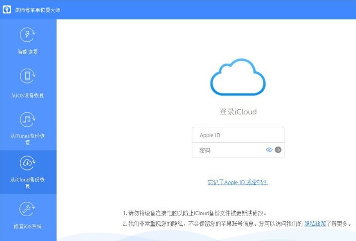 填寫iCloud賬戶信息,軟件永遠(yuǎn)不會記錄您的iCloud賬戶信息及相關(guān)內(nèi)容。