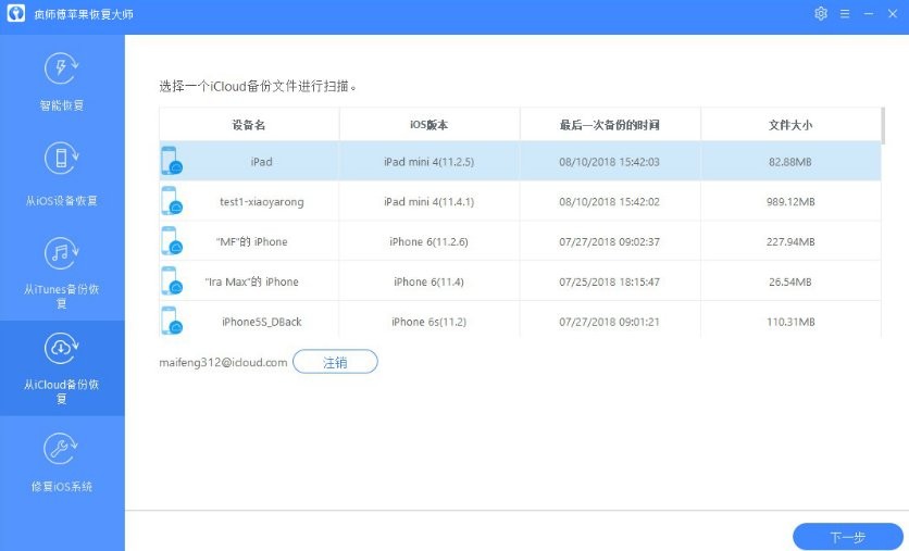 請等待幾分鐘, 瘋師傅蘋果恢復(fù)大師 (iMyFone D-Back)將會下載您的iCloud備份,選擇待恢復(fù)數(shù)據(jù)所在iCloud備份,并點(diǎn)擊右下角的“下一步”按鈕。