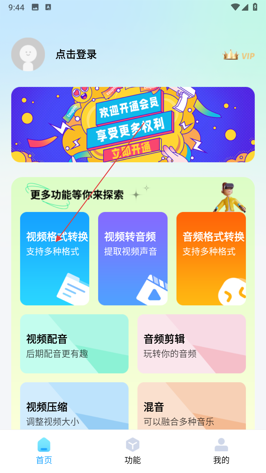 1、打開格式轉換器應用,在首頁找到視頻格式轉換功能模塊并點擊。