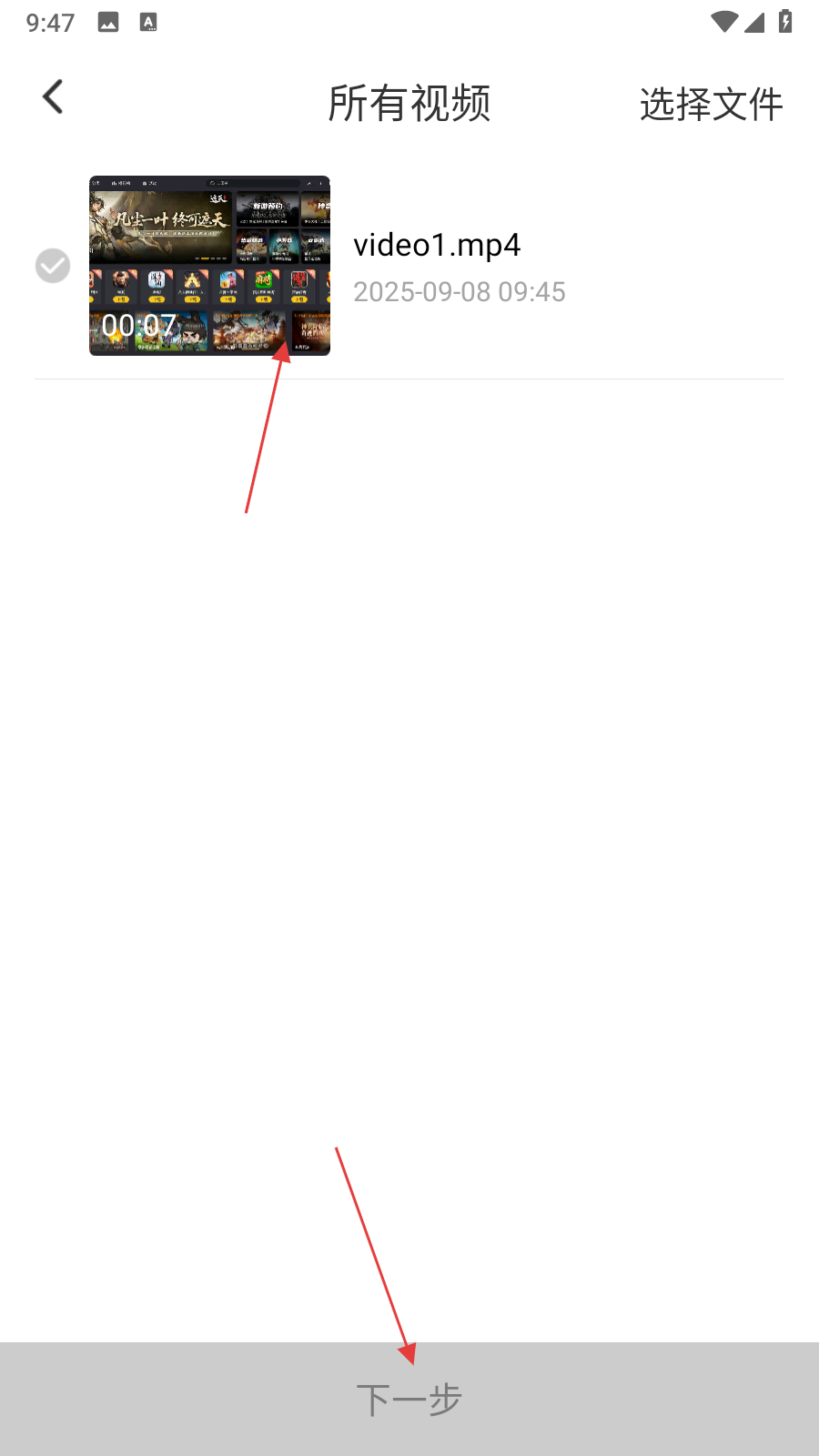 2、在視頻選擇頁面中,找到并點擊需要轉換格式的視頻,然后點擊頁面底部的下一步按鈕。