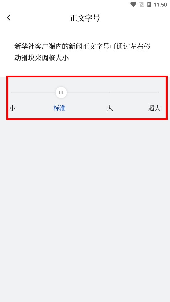 3、進(jìn)入正文字號設(shè)置頁面后,通過左右移動滑塊,即可調(diào)整字號大小。