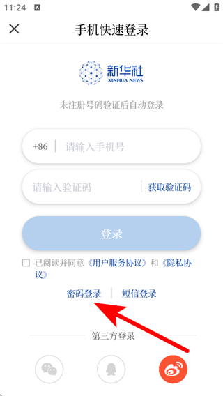 3、在手機(jī)快速登錄頁面,點(diǎn)擊密碼登錄,進(jìn)入賬號密碼登錄頁面。