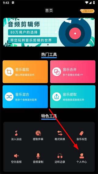 1、在首頁特色工具區(qū)域,點(diǎn)擊個(gè)人中心進(jìn)入個(gè)人頁面。