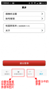 7、點擊更多按鈕可以進行攝像機其他功能設置和賬號管理還可以進行客戶端升級,退出按鈕也在這個界面,如下圖所示: