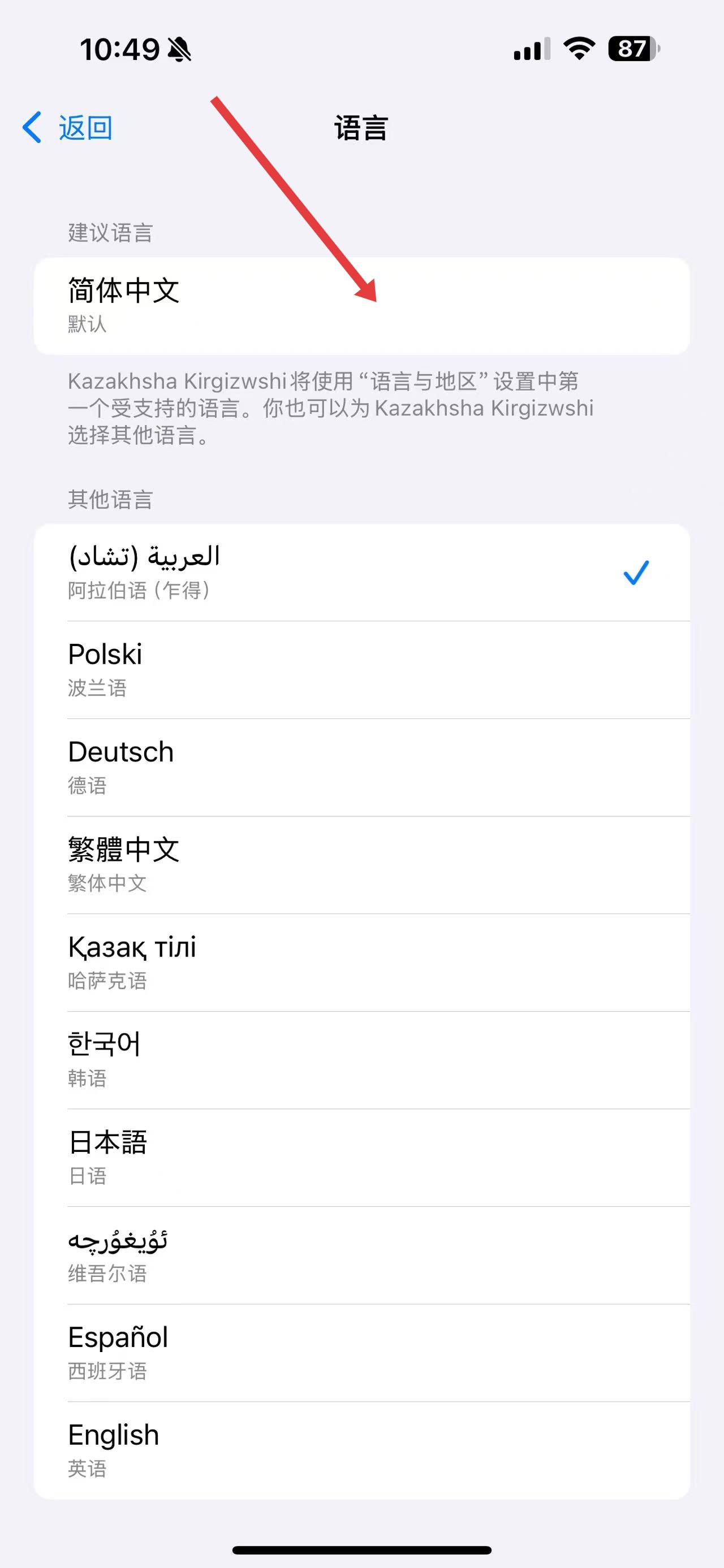 3.在語(yǔ)言設(shè)置頁(yè)面,下滑找到簡(jiǎn)體中文,點(diǎn)擊選擇,即可將輸入法界面語(yǔ)言改為中文。