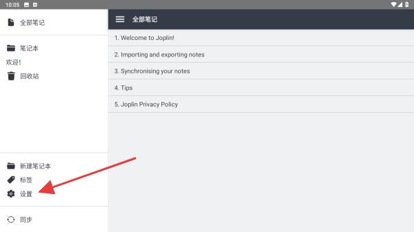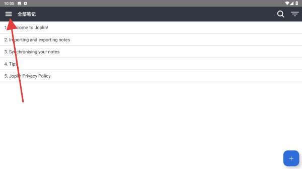 1、打開joplinAPP,在首頁(yè)內(nèi)點(diǎn)擊左上角三個(gè)橫線的圖標(biāo)。