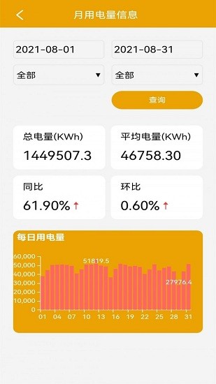 3、每日,每月,每年的用電情況都可以在平臺(tái)上進(jìn)行查看,而且還會(huì)精確到每小時(shí),數(shù)據(jù)還會(huì)長(zhǎng)時(shí)間進(jìn)行保存,方便用戶定期查看。