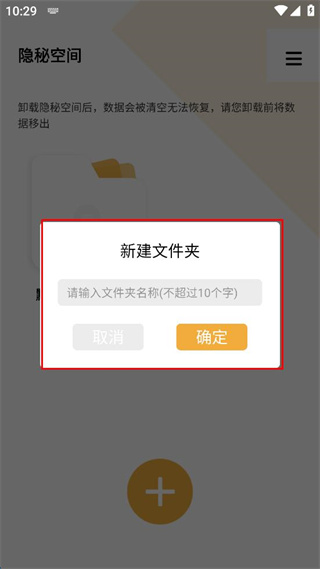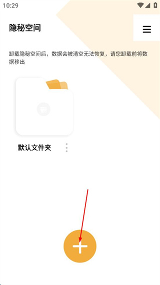 2、進(jìn)入隱秘空間主界面,點(diǎn)擊底部橙色加號(hào)按鈕,觸發(fā)新建文件夾操作。