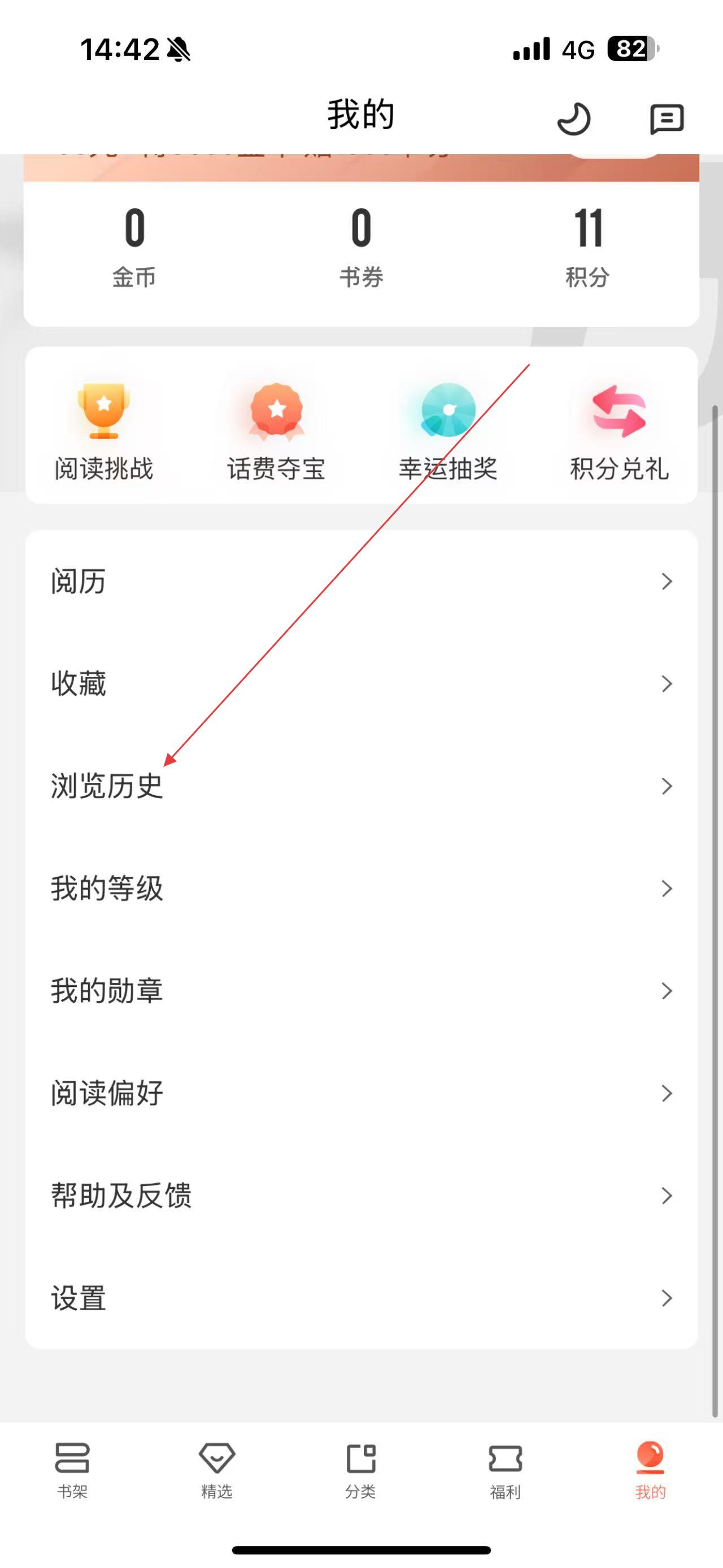 2、在個(gè)人頁面里,找到并點(diǎn)擊瀏覽歷史選項(xiàng)進(jìn)入閱讀記錄界面。