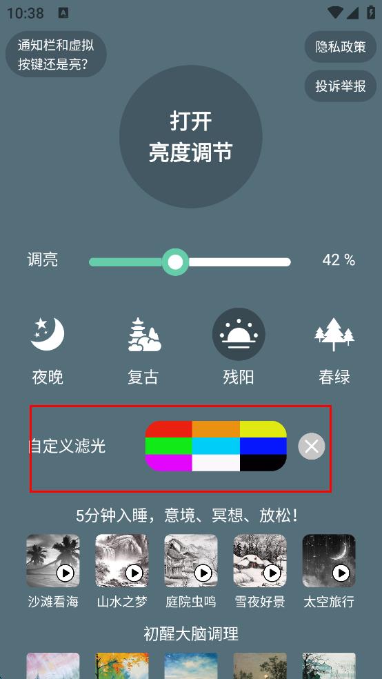 4、在“自定義濾光”區(qū)域,可選擇不同顏色方塊,設置自定義濾光效果。
