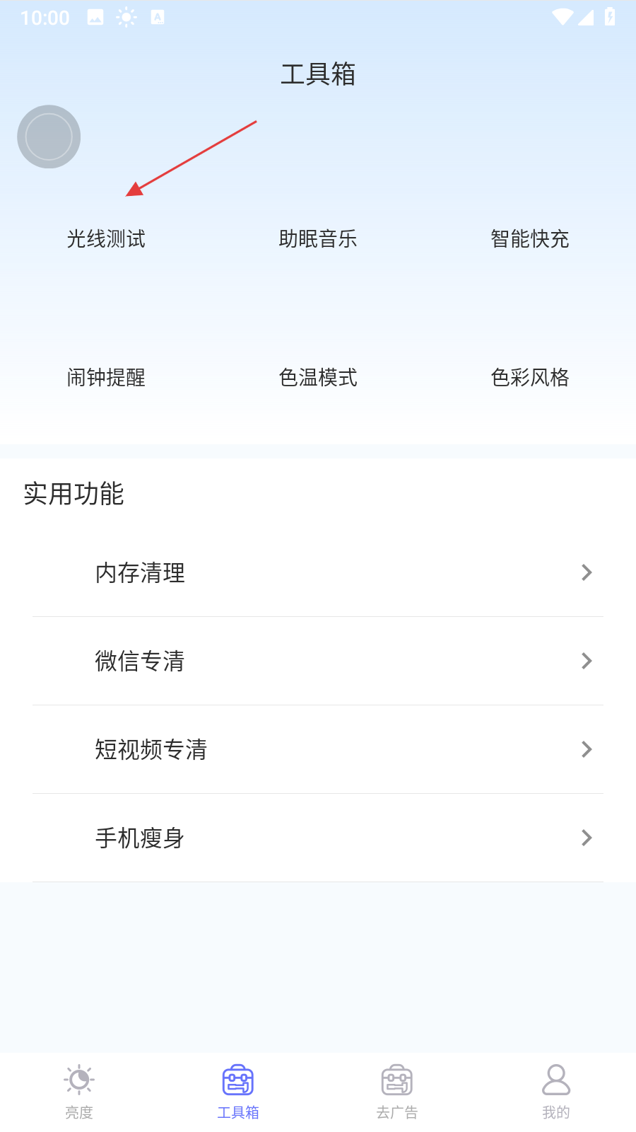 1、打開(kāi)手機(jī)亮度調(diào)節(jié)器應(yīng)用,進(jìn)入工具箱頁(yè)面,點(diǎn)擊光線(xiàn)測(cè)試選項(xiàng),進(jìn)入光線(xiàn)測(cè)試界面。