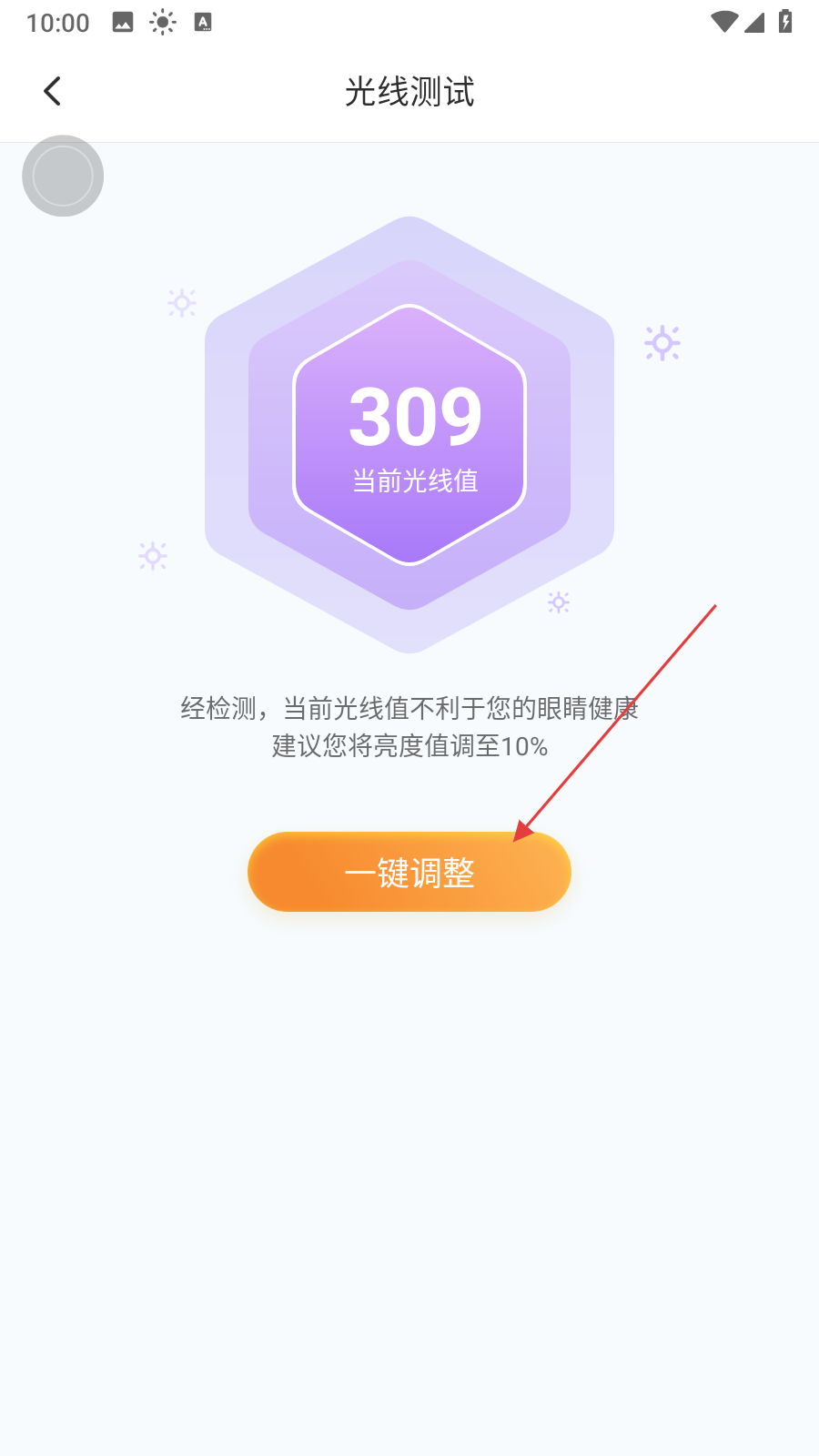 2、在光線(xiàn)測(cè)試界面,應(yīng)用會(huì)自動(dòng)檢測(cè)當(dāng)前光線(xiàn)值并給出提示,點(diǎn)擊橙色一鍵調(diào)整按鈕,應(yīng)用會(huì)自動(dòng)將亮度調(diào)至建議數(shù)值。