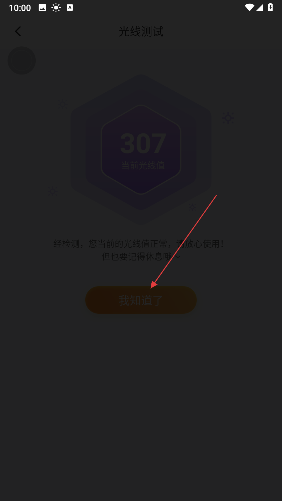3、調(diào)整完成或確認(rèn)光線(xiàn)狀態(tài)后,點(diǎn)擊我知道了按鈕,即可完成本次光線(xiàn)測(cè)試與亮度調(diào)節(jié)操作。