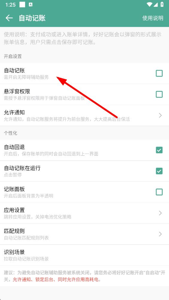 3、在自動(dòng)記賬設(shè)置頁面,點(diǎn)擊自動(dòng)記賬選項(xiàng),根據(jù)提示進(jìn)入手機(jī)無障礙設(shè)置界面。