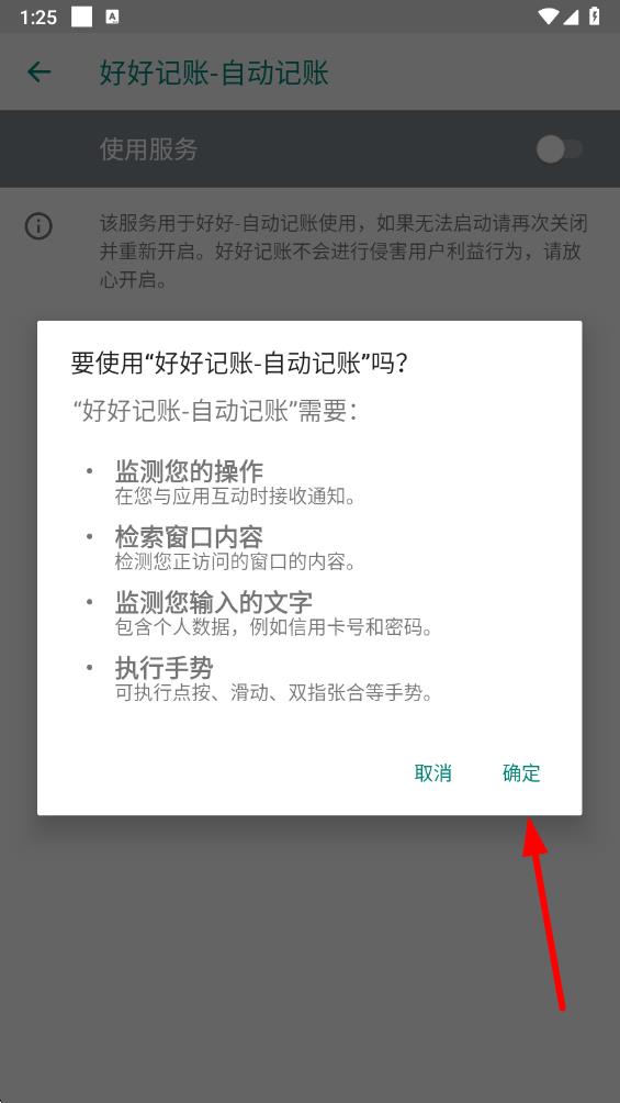 6、在彈出的權(quán)限確認(rèn)提示框中點(diǎn)擊確定,即可開啟自動(dòng)記賬功能。