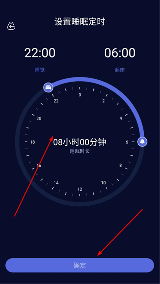 3、通過調(diào)整時鐘上的睡覺和起床時間,設(shè)置睡眠時長,點(diǎn)擊確定。
