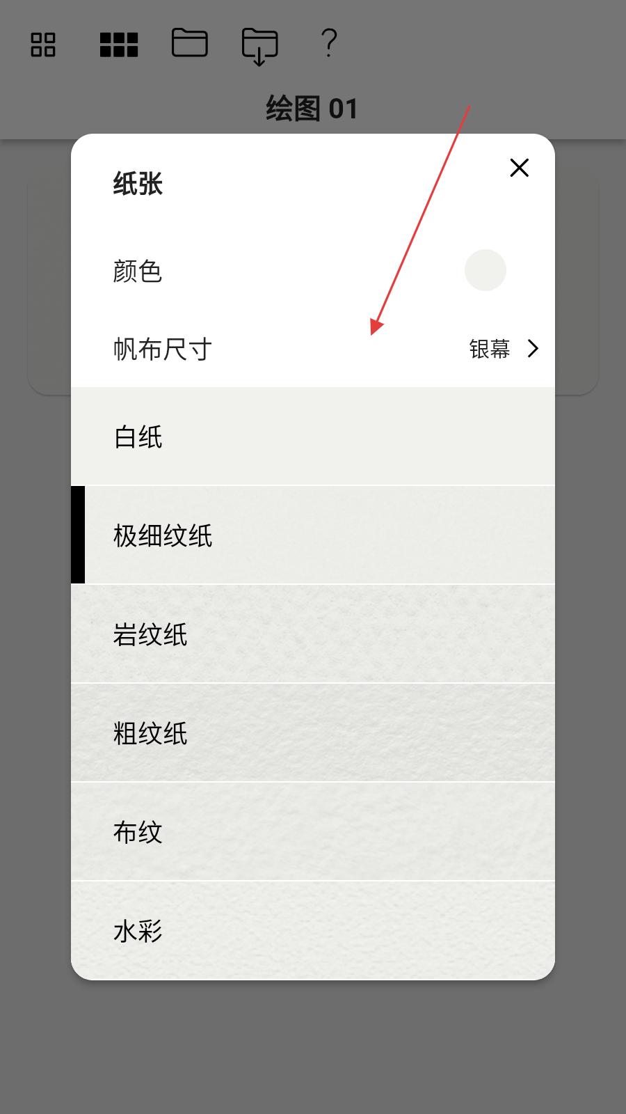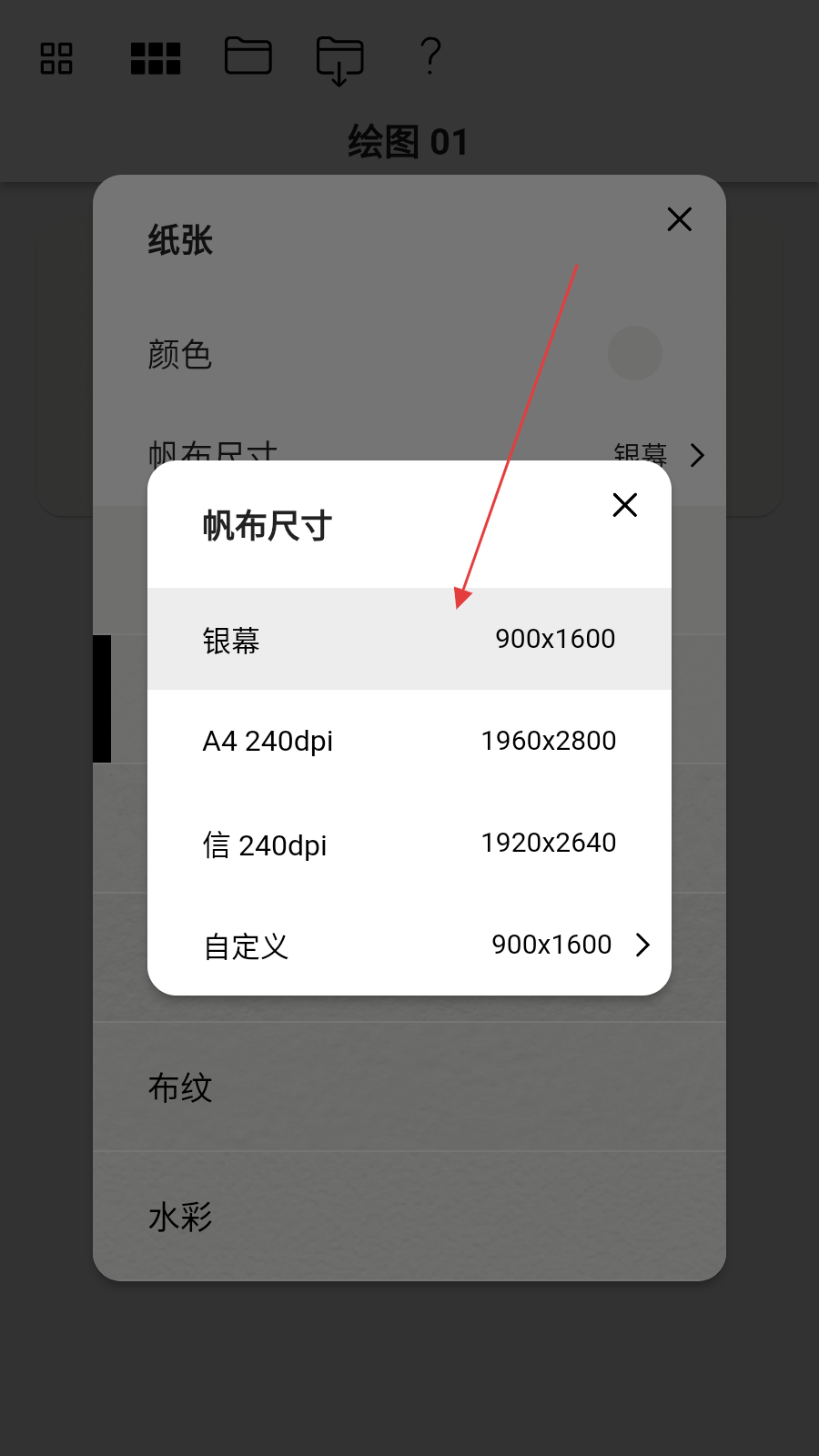 2、在紙張?jiān)O(shè)置菜單中,找到帆布尺寸選項(xiàng)并點(diǎn)擊,進(jìn)入帆布尺寸選擇界面查看預(yù)設(shè)及自定義選項(xiàng)。