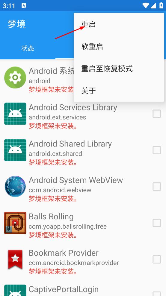 4.安裝夢境app,管理夢境和xp模塊的,同xpinstaller類似,重啟手機后再進入夢境app,顯示綠色√就表示夢境安裝好了;