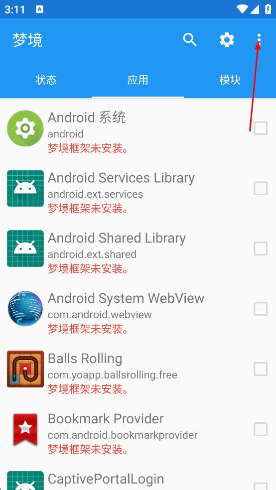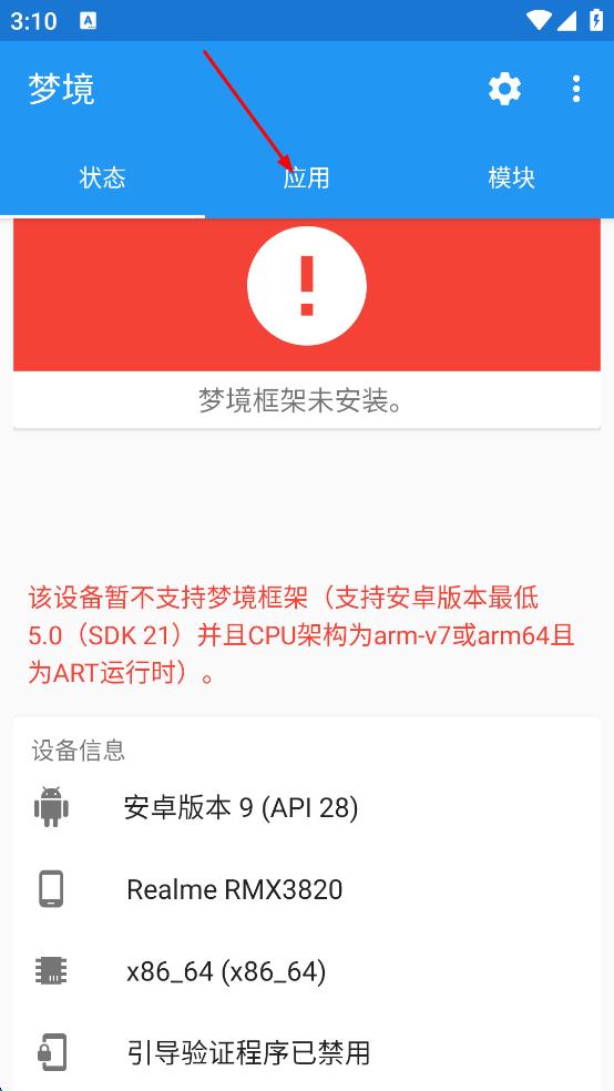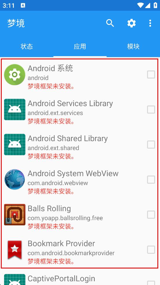 2、在應用頁面,可看到多個應用顯示“夢境框架未安裝”,了解應用與框架的關聯(lián)情況。