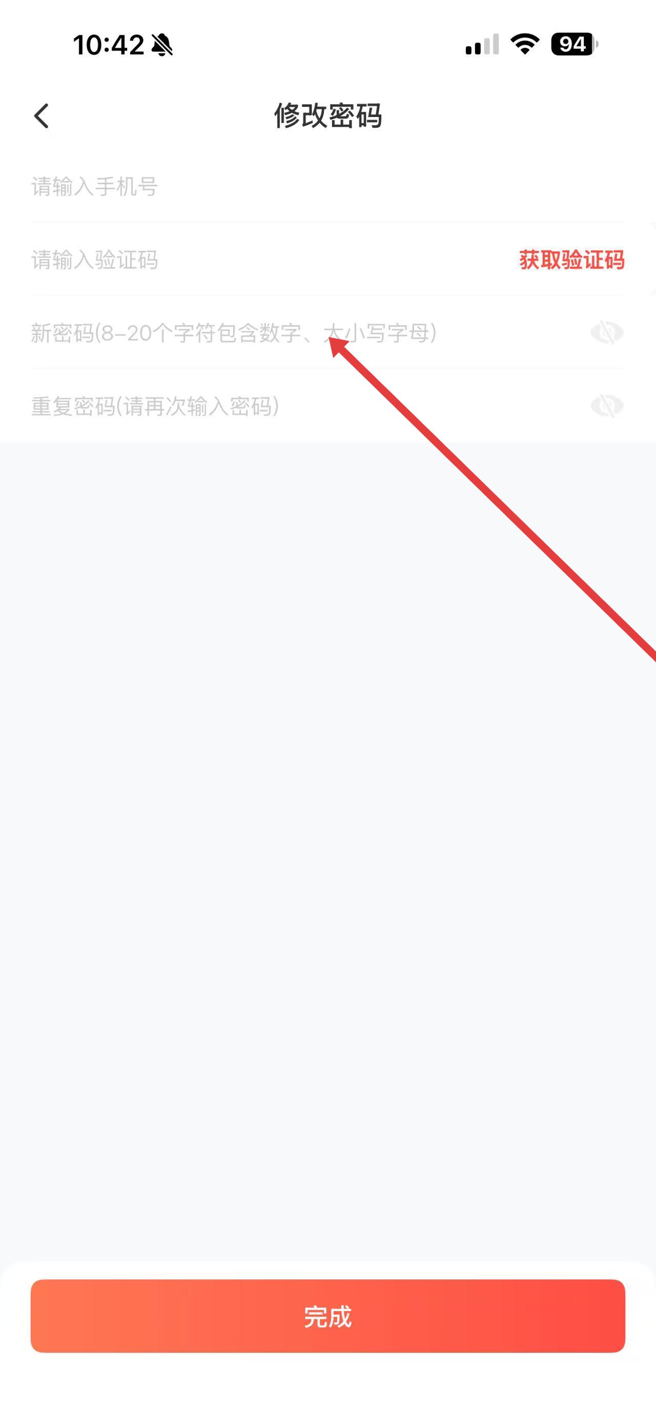 4、在修改密碼頁(yè)面,按要求依次輸入手機(jī)號(hào)、獲取并填寫驗(yàn)證碼,再設(shè)置新密碼,最后點(diǎn)擊完成即可修改成功。