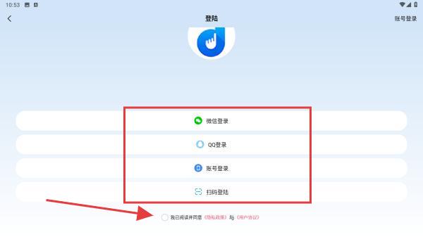 3、在登錄頁面,可選擇微信、QQ、賬號登錄或掃碼登陸,并勾選底部我已閱讀并同意條款。
