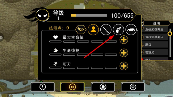 2、在地圖界面,點(diǎn)擊下方人物圖標(biāo),進(jìn)入等級(jí)與技能界面。