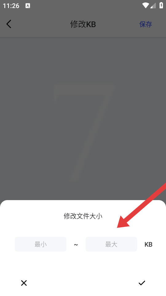 4、在大小設置彈窗中,輸入KB數(shù)值范圍后,點擊右下角確認,完成像素大小修改。
