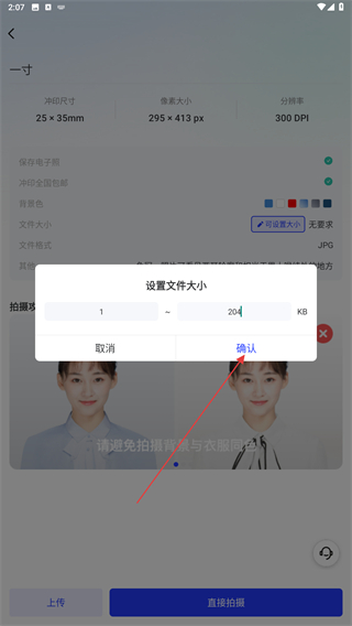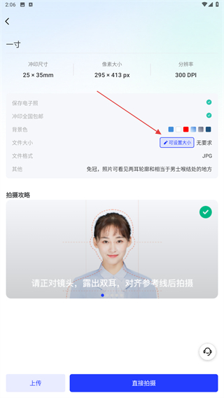 2、進入一寸拍照的頁面內,點擊設置文件大小的按鈕。