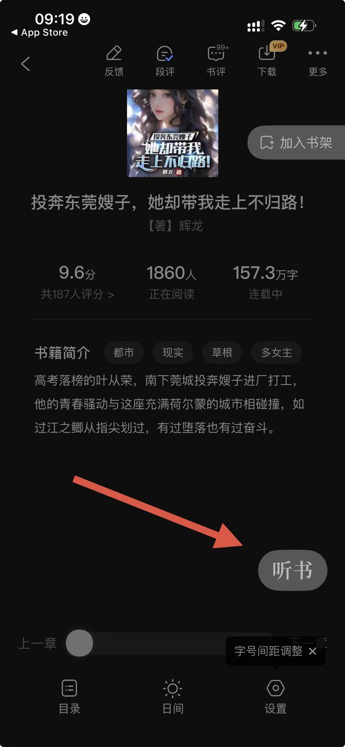 3、在書籍詳情頁面,點擊聽書按鈕,進入聽書界面。