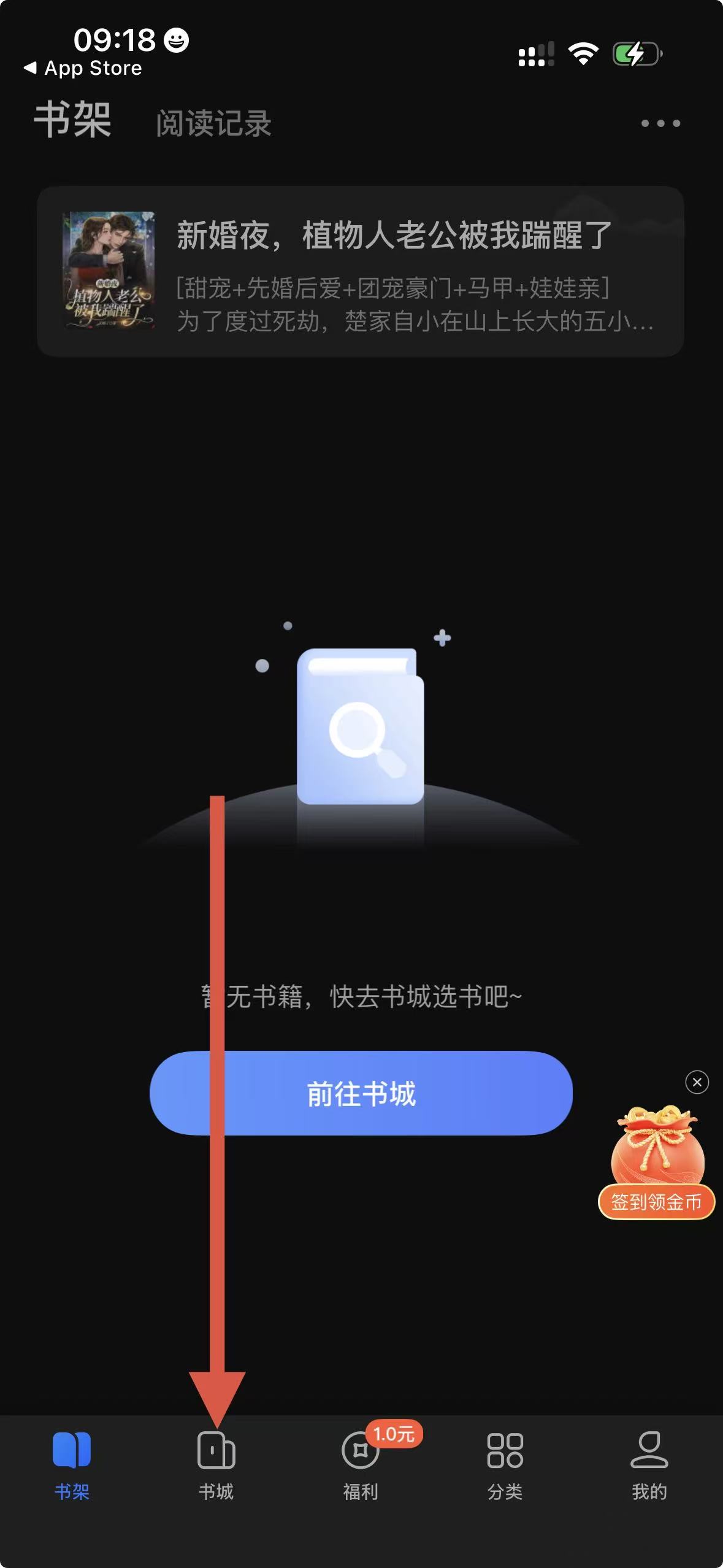 1、在江湖小說免費閱讀app書架頁面,點擊下方書城選項,進入書城界面。