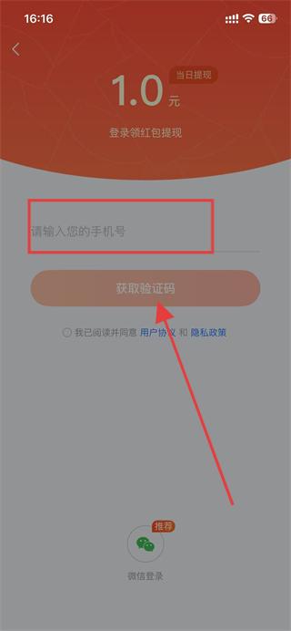 3、在登錄界面的輸入框中,填寫手機號碼,點擊獲取驗證碼。