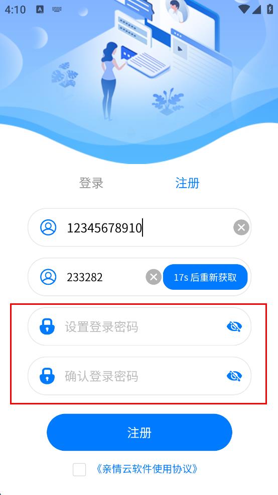 4、設(shè)置好密碼后,勾選親情云軟件使用協(xié)議,點(diǎn)擊“注冊(cè)”按鈕,完成親情云賬號(hào)注冊(cè)操作。