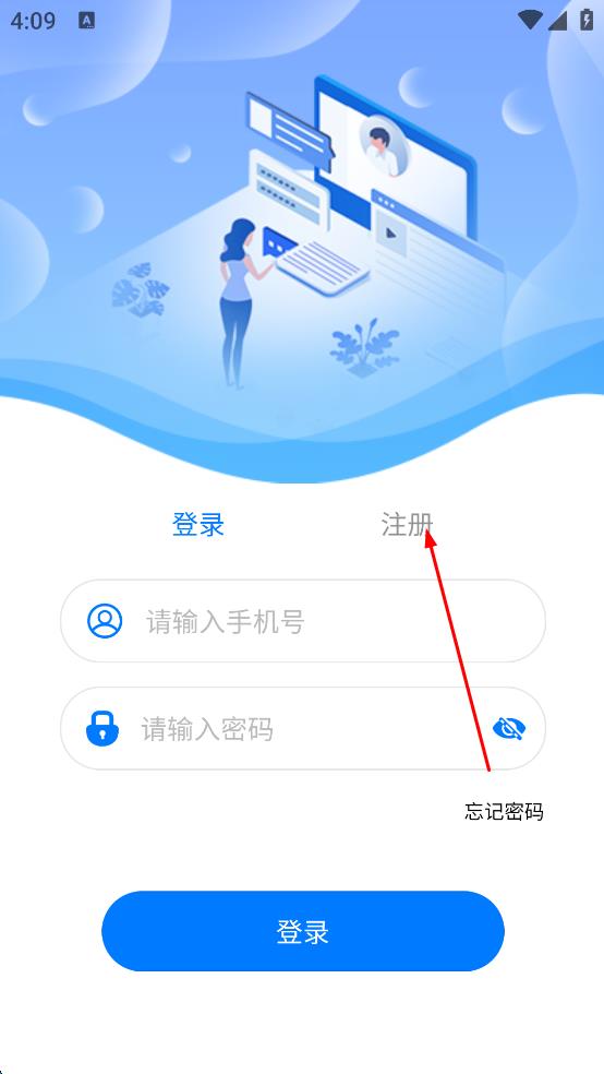1、打開親情云,進(jìn)入登錄注冊(cè)界面,界面有“登錄”“注冊(cè)”選項(xiàng),還有手機(jī)號(hào)、密碼輸入框,點(diǎn)擊“注冊(cè)”選項(xiàng)。