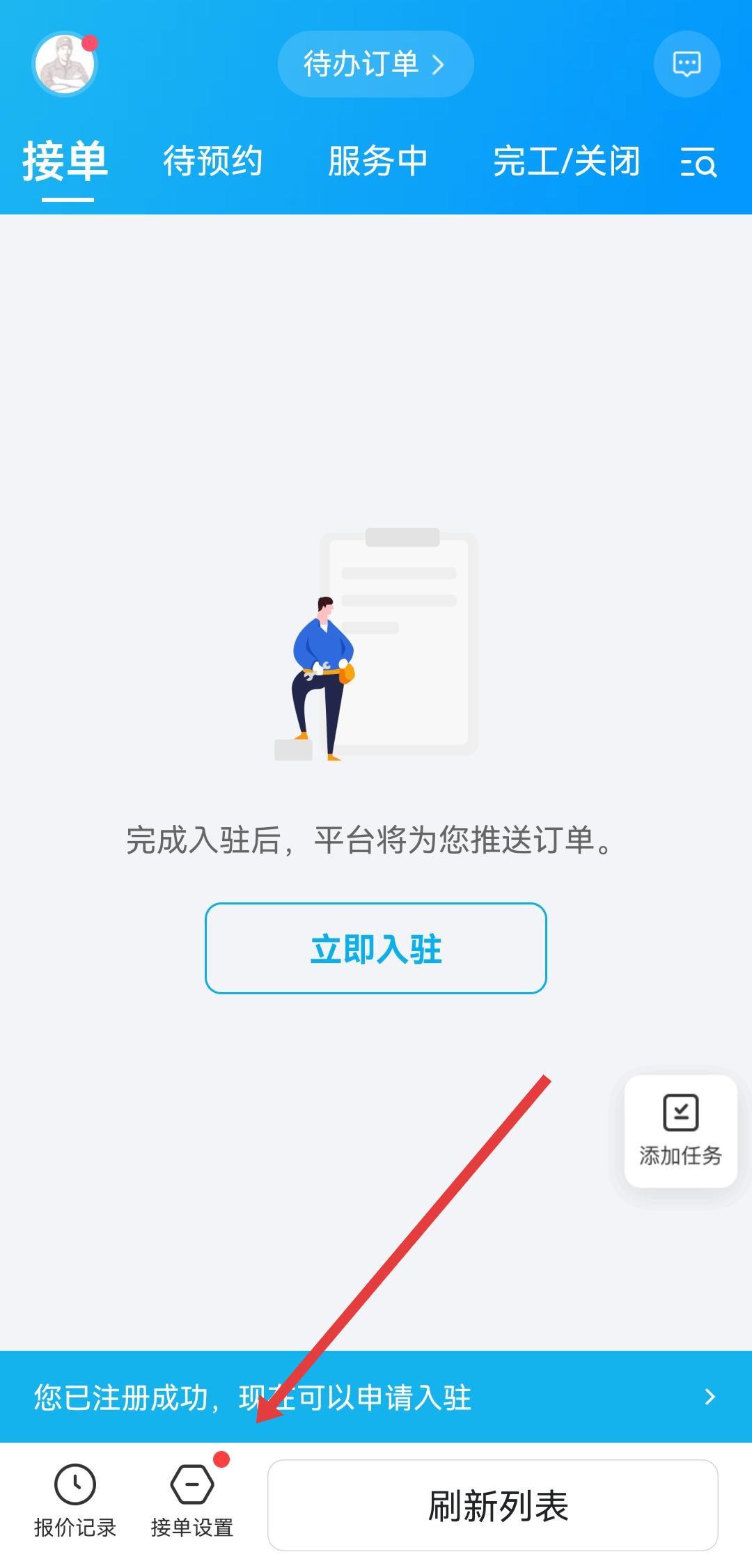 1、打開萬師傅師傅版APP,點(diǎn)擊底部我的選項(xiàng),進(jìn)入個(gè)人中心頁面,找到接單設(shè)置功能并點(diǎn)擊。
