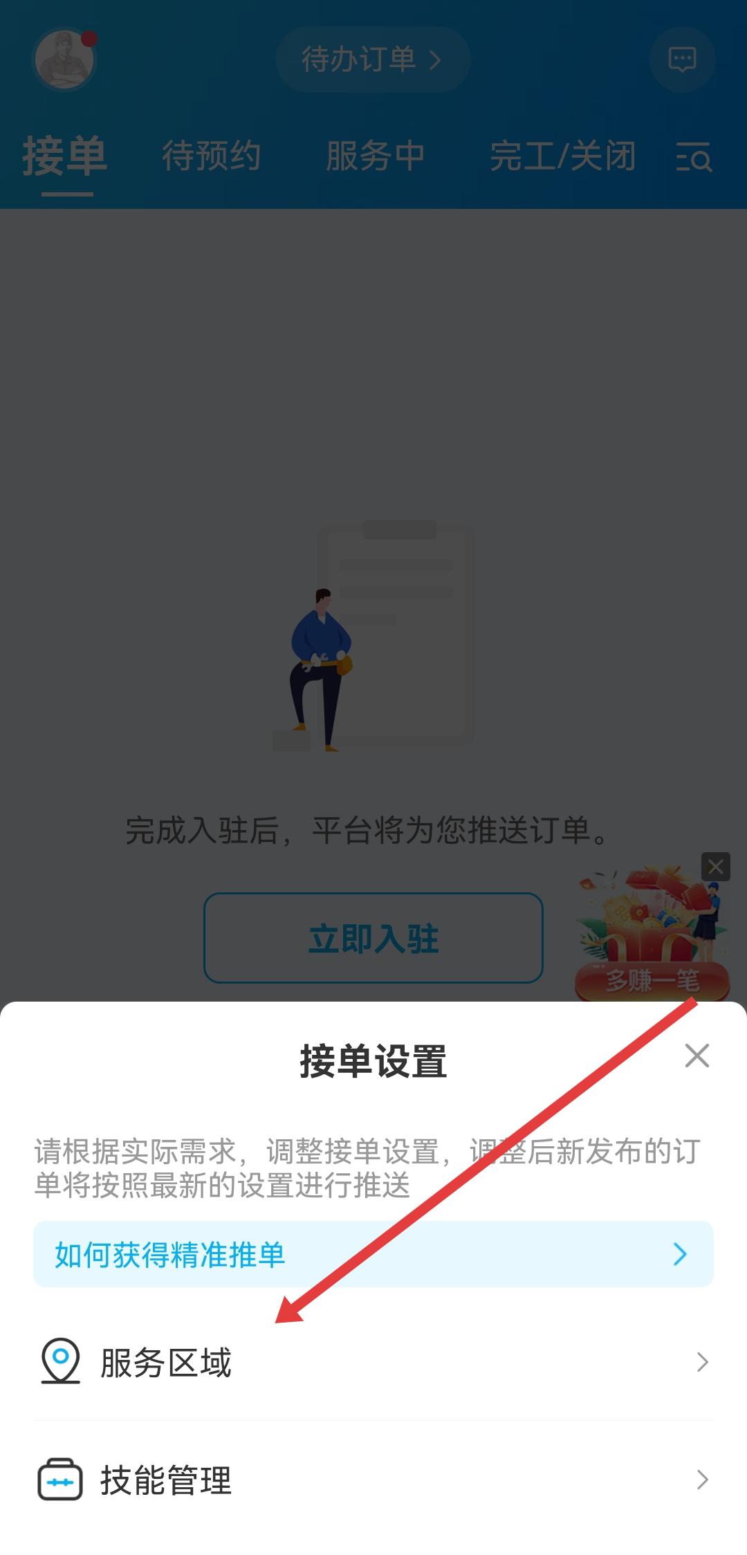 2、在設(shè)置頁面中,找到服務(wù)區(qū)域設(shè)置選項(xiàng),不同版本可能顯示為接單區(qū)域、工作區(qū)域等,點(diǎn)擊進(jìn)入?yún)^(qū)域選擇界面。