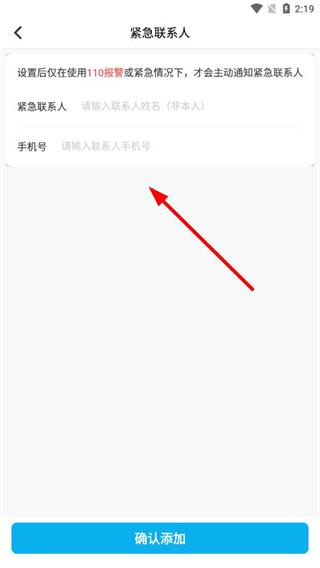 4、在緊急聯(lián)系人頁面,輸入聯(lián)系人信息,點(diǎn)擊確認(rèn)添加即可完成。
