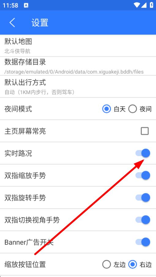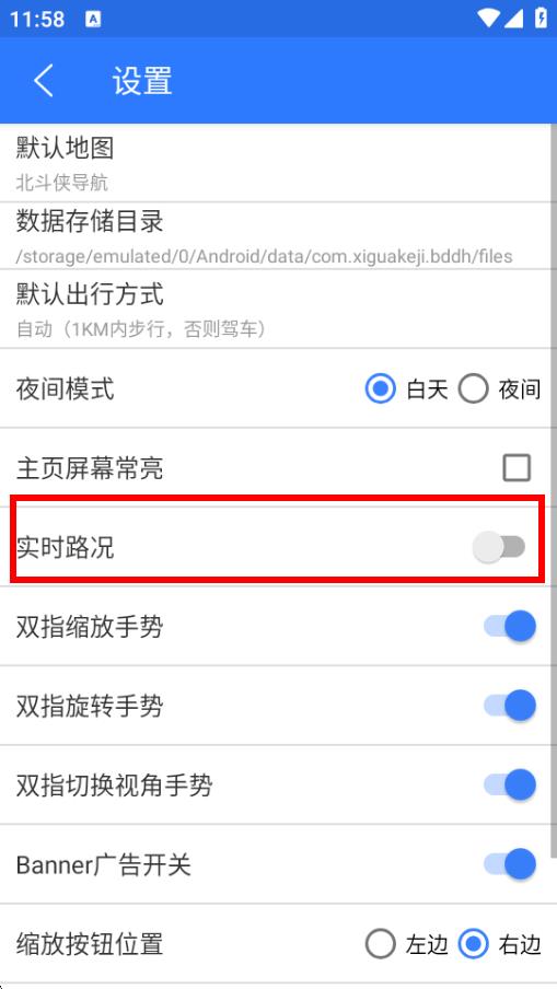 4、點(diǎn)擊實(shí)時(shí)路況右側(cè)的開關(guān)按鈕,將其切換至開啟狀態(tài),即可打開實(shí)時(shí)路況功能。