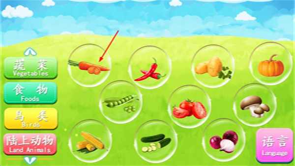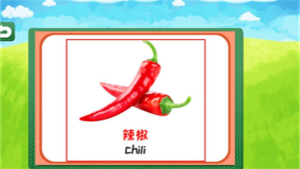 4、繼續(xù)選擇蔬菜分類中的辣椒圖標(biāo),查看辣椒的圖文信息,學(xué)習(xí)其名稱和英文表達(dá)。