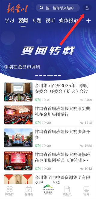 1、打開新金川APP首頁,點擊右上角個人圖標(biāo),進入個人頁面。
