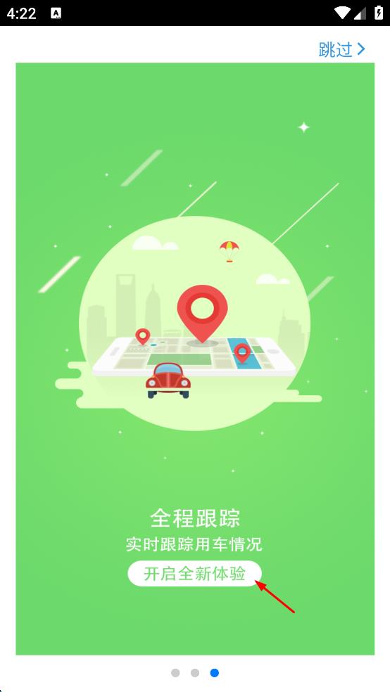 1、打開公務用車APP,會看到“全程跟蹤 實時跟蹤用車情況”的引導頁面,點擊“開啟全新體驗”按鈕,進入APP主界面。