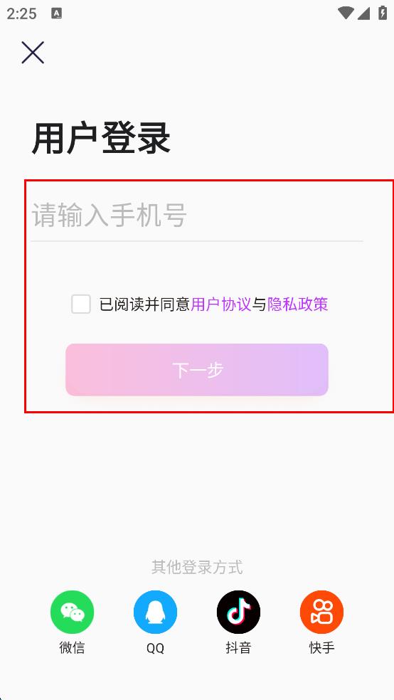 4、在用戶登錄界面輸入手機(jī)號,勾選已閱讀并同意用戶協(xié)議與隱私政策,點擊下一步,完成登錄操作。
