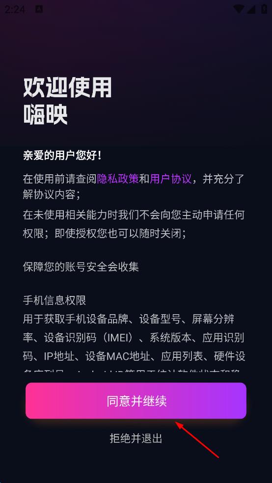 1、打開嗨映,彈出使用提示,點擊同意并繼續(xù),進(jìn)入軟件首頁。