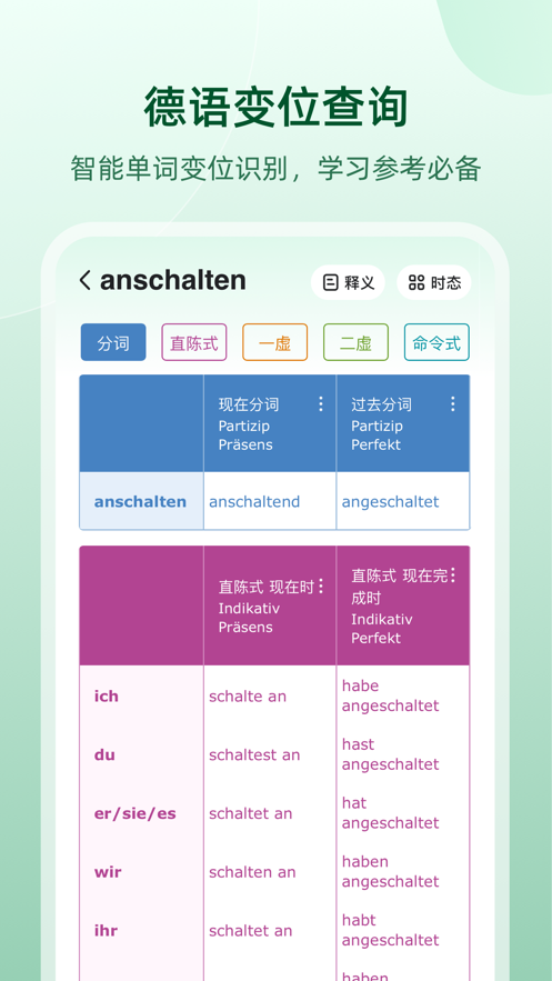 德語(yǔ)動(dòng)詞變位查詢,提供17種時(shí)態(tài)的動(dòng)詞變位反查功能;