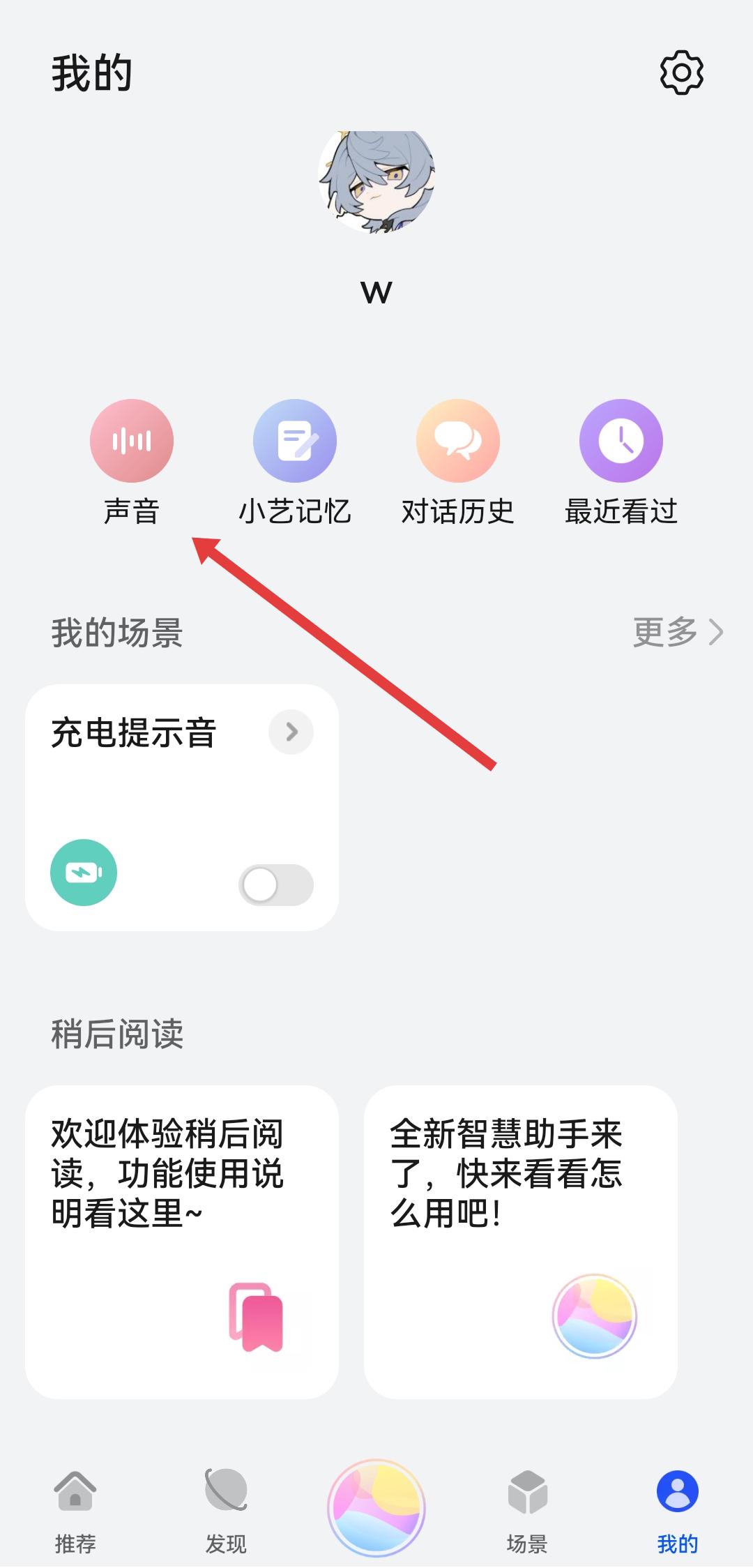 1、打開智慧助手APP,進入我的頁面,點擊聲音的選項,進入聲音設置界面。