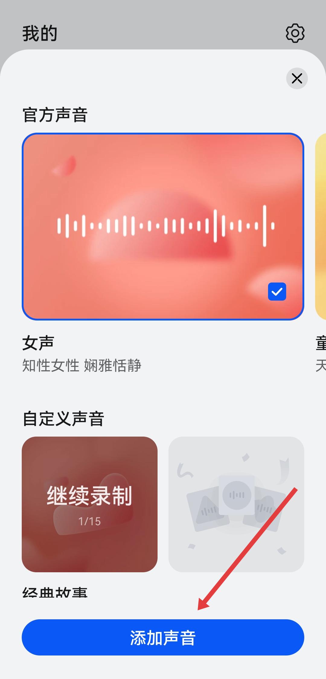 2、在聲音設置界面,點擊添加聲音的按鈕,進入自定義聲音創(chuàng)建的流程。