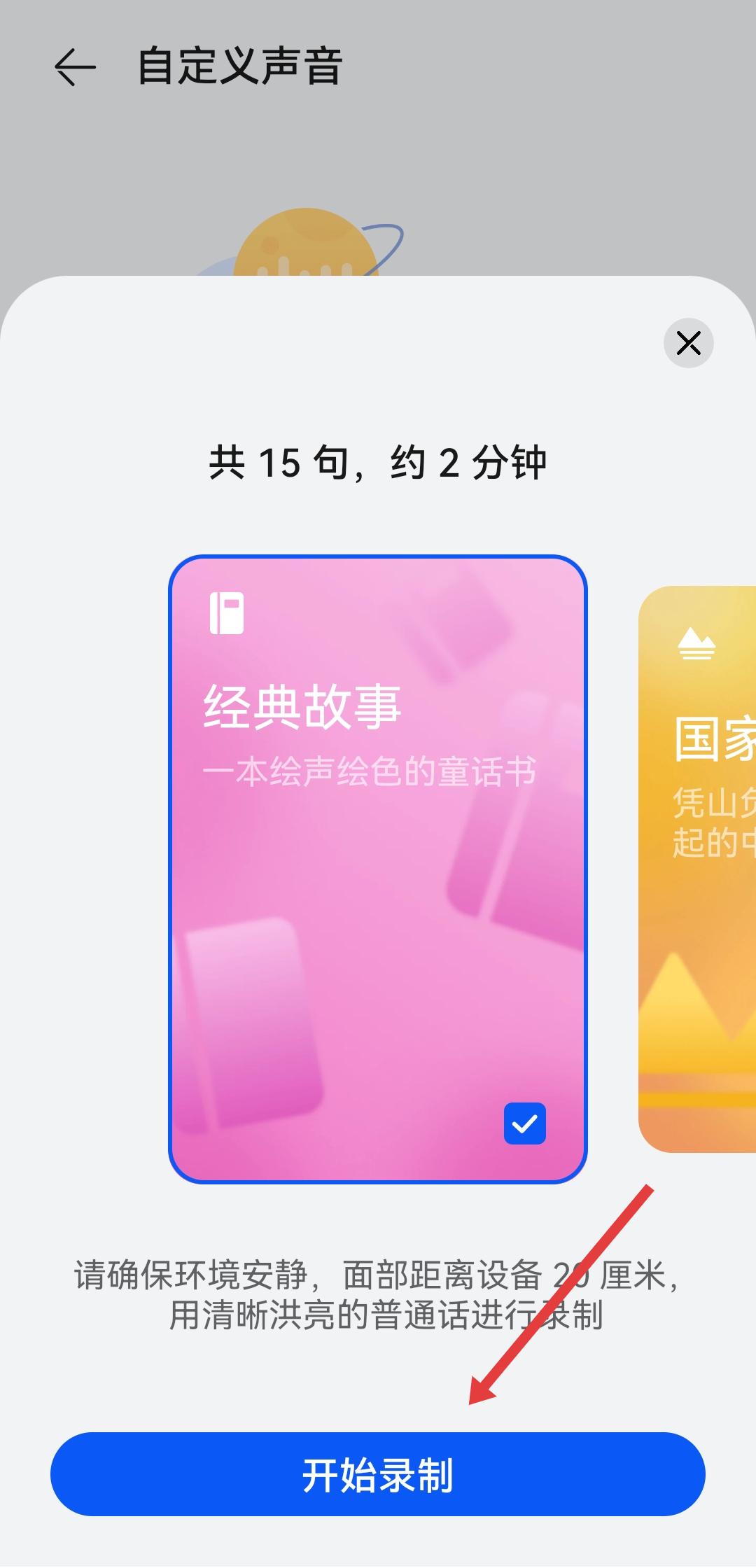 4、選擇錄制內容,點擊開始錄制按鈕,按照提示完成15句語音錄制,即可創(chuàng)建并設置自己的聲音。