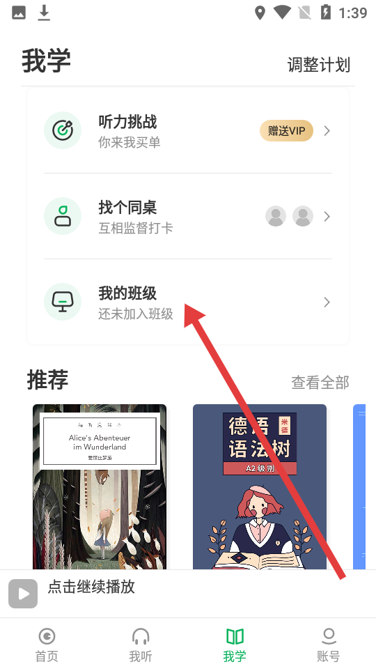 1、打開(kāi)每日德語(yǔ)聽(tīng)力APP,點(diǎn)擊底部導(dǎo)航欄中的我學(xué),然后點(diǎn)擊我的班級(jí)。