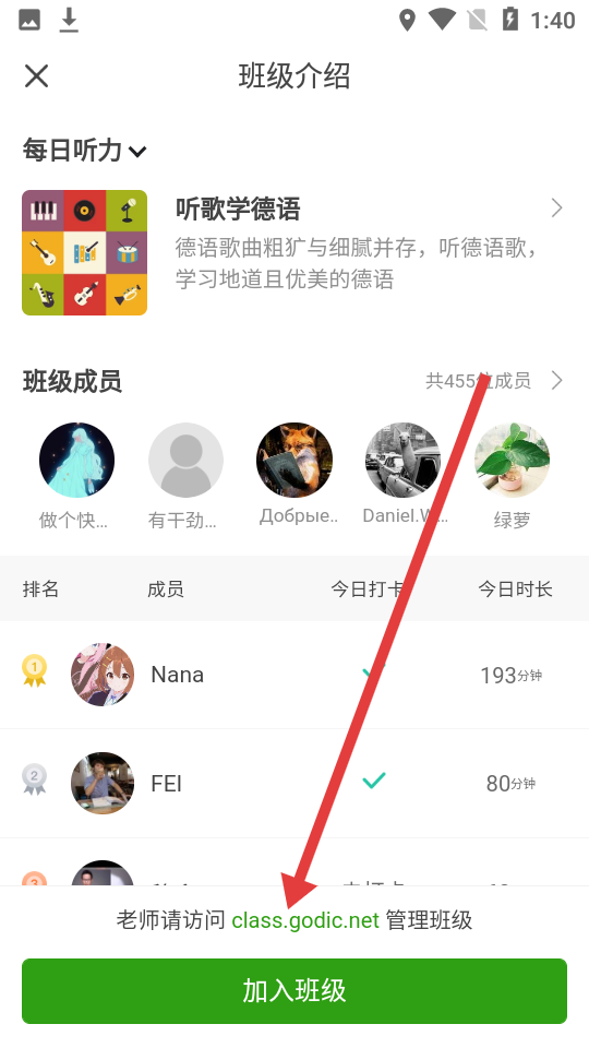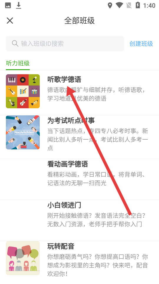 2、在全部班級(jí)頁(yè)面中,瀏覽并選擇你想要加入的班級(jí),如聽(tīng)歌學(xué)德語(yǔ)。