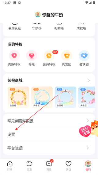 1、打開對緣應(yīng)用,點(diǎn)擊底部我的進(jìn)入個人頁面,在個人頁面中找到設(shè)置選項(xiàng)并點(diǎn)擊。