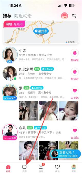 1、打開對緣APP,點(diǎn)擊底部交友,進(jìn)入交友頁面。